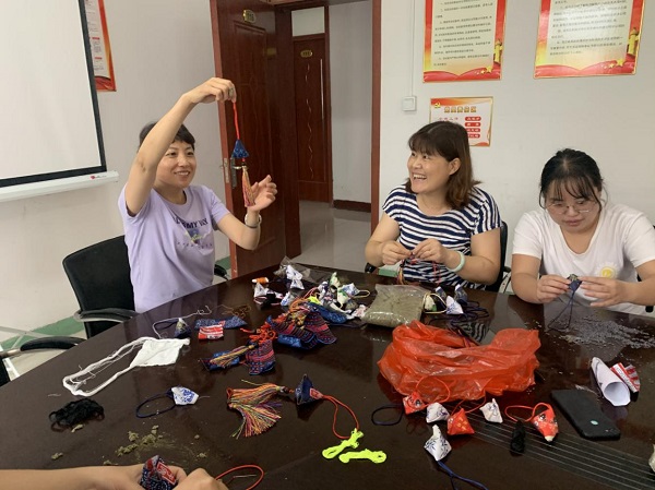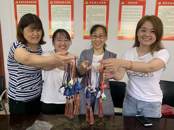 在傳統(tǒng)習(xí)俗中,玲瓏可愛的各色香包也是端午節(jié)必不可少的元素。包完粽子后大家轉(zhuǎn)移陣地到了活動室,大家圍坐桌邊,面前堆放著一份份材料包,有棉布、艾草、針線、中國結(jié)流蘇。面對這個從來沒有做過的DIY,大家開始研究起來,有的用手機(jī)搜索縫制方法流程,有的直接比來比去親自摸索著縫起來。有職工說:“這有點(diǎn)像咱們小時候老人們縫的毽子,那個里面裝的是五谷雜糧,咱們現(xiàn)在裝的是艾草。”“這香囊可以掛在辦公室或者車上,有清香、驅(qū)蚊的功效?!薄拔宜闶侵懒?,這個流蘇應(yīng)該縫在這個邊的中間,而不是角上……”大家你一句我一句,手中的針線穿梭在棉布間,用密密的針腳縫制出傳統(tǒng)佳節(jié)最好的注解,用絲絲線線纏繞出端午安康的美滿寓意,一個個精巧可愛的三角香囊在大家的努力下完美呈現(xiàn)。