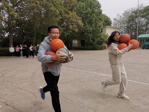 “誰先來?抱球游戲升級(jí)——1人抱4個(gè)籃球向前奔跑,過程中一個(gè)球也不得落地,否則成績無效?!辈门兄坏膶徲?jì)科長談增迫不及待地宣布?!皞€(gè)子高的胳膊、腿長,有優(yōu)勢(shì),先上?!比巳豪镉腥颂嶙h,工程科身高一米八的帥小伙劉文浩和綜合辦高個(gè)子王春影舉手示意,跑道上呈現(xiàn)二人灑脫、漂亮的抱球姿勢(shì)。