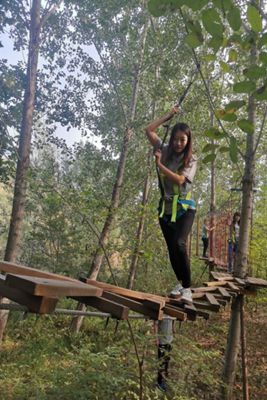 “叢林穿越”項目最受大家歡迎,有空中秋千、索道、走鋼絲、獨木橋、空中云梯、吊橋等一系列的拓展環(huán)節(jié)。叢林穿越過程中,劉暢作為今年新入職的職工,第一個走上了獨木橋的平臺上,只見她的雙手緊緊地抓住兩邊的繩子,目光堅定,腳步穩(wěn)健,順利完成了第一個挑戰(zhàn)項目——獨木橋。隨后,來到走鋼絲的環(huán)節(jié),只見她小心翼翼試了試腳感,感覺比較安全,然后小碎步開始向前走。突然,鋼絲像秋千似的蕩起來,于是她就改變了策略,邁開大步向前走,本來晃動挺厲害的鋼絲慢慢靜止下來,找到了最佳的方法后,還不忘向后面的同事傳授闖關(guān)秘籍,最后在她不懈的努力下闖關(guān)成功。就在大家紛紛踴躍嘗試拓展項目的過程中,發(fā)生了一個令人感動的小插曲。機關(guān)后勤人員桂淑霞在闖空中云梯環(huán)節(jié)中,由于體力不支,突然她的雙腿從梯子的空隙中跌落下去,卡在梯子中,動彈不得。正在后面闖關(guān)的財務(wù)科科長宋敬凱看到了這一幕,他不顧自己的安危,飛快跑過去,幫桂淑霞把雙腿從空隙中“拔”了出來,使她脫離險境。