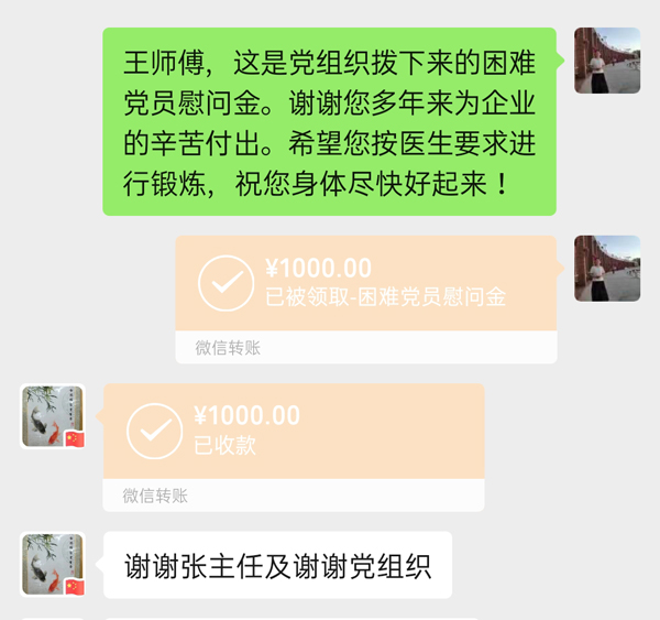 “現(xiàn)在身體怎么樣?生活可有什么困難?”因受疫情影響,不能對所有困難黨員和困難職工實(shí)現(xiàn)入戶走訪,公司黨委和工會就通過電話一一聯(lián)系,仔細(xì)詢問他們疫情防控期間生活情況、身體健康狀況,根據(jù)他們的實(shí)際情況,將慰問金通過微信轉(zhuǎn)賬發(fā)給個(gè)人,米面油等慰問品能送到小區(qū)門口的送到小區(qū)門口,能送到工地的送到工地。