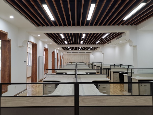 在該項目的裝飾設計中,設計院充分利用原建筑條件,在盡可能節(jié)約裝修成本的基礎上,將辦公環(huán)境打造成為簡約優(yōu)雅、別具一格的空間。改造區(qū)域原為多個小型辦公室,并且處于院落的南面,采光極差。設計師經(jīng)過與領導協(xié)商,除保留個別房間外,將剩余的幾個辦公室隔墻拆除,從而獲得了一個大而開敞的辦公區(qū),可容納36個寬敞工位,并取消此辦公區(qū)域所有的門,且將原窗戶臺面降低至距地40厘米高,最大可能的利用了自然采光。色調(diào)的選擇上,墻面大面積采用白色乳膠漆與硅藻泥,一定程度上也彌補了自然采光的不足。