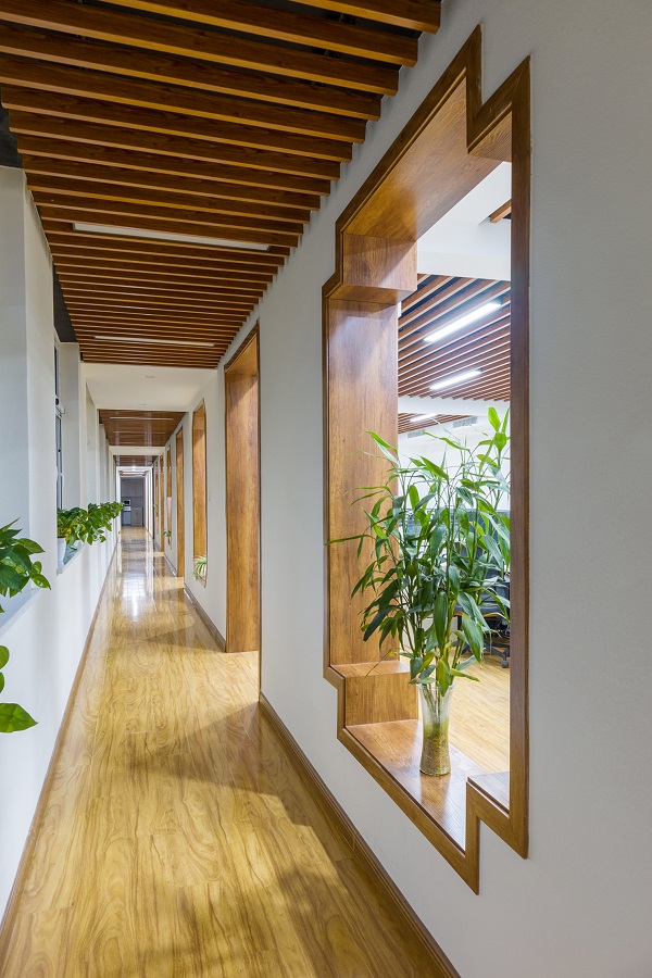 由于辦公區(qū)裸露門洞窗洞較多,極具藝術感,于是在設計風格方面設計師借鑒了中式古典花窗元素,將四個窗洞設計為不同造型,曲直轉(zhuǎn)折均一絲不茍,淋漓盡致地展現(xiàn)出中式古典花窗的特點,使得簡潔的空間多了一絲東方韻味。這樣舒適雅致的辦公環(huán)境更能激發(fā)設計師的創(chuàng)作靈感,讓設計師創(chuàng)作出更好的設計作品。