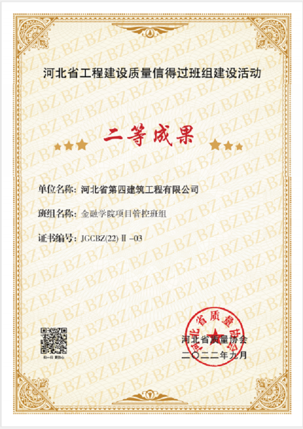9月16日,六分公司收到了河北省質(zhì)量協(xié)會頒發(fā)的證書,河北金融學(xué)院項(xiàng)目管控班組榮獲“河北省工程建設(shè)質(zhì)量信得過班組建設(shè)活動”二等成果,并被推薦到中國建筑業(yè)協(xié)會交流。