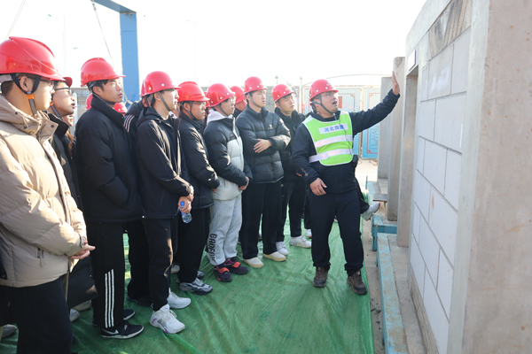 下午14:00,活動準時開始。活動分為實地參觀和座談兩個環(huán)節(jié)。參觀前,項目經(jīng)理李士寧為大家進行了安全教育培訓。隨后,李士寧將學生分為質(zhì)量、技術(shù)、安全三個組別,由相關(guān)人員帶領(lǐng)到現(xiàn)場參觀。參觀過程中,相關(guān)人員圍繞項目生產(chǎn)經(jīng)營情況,深入淺出地向師生們講解了技術(shù)管理、質(zhì)量管理、安全管理方面的知識,同時回答了學生們的提問。在參觀醫(yī)療康復樓的時候,學生們好奇地問“這是什么?”項目技術(shù)負責人告訴他們那是盤扣式腳手架,并介紹了組成架體的構(gòu)件。學生們紛紛表示,這樣“零距離”參觀,不僅有助于把理論知識和實踐應用相結(jié)合,更讓他們了解到了最前沿的施工技術(shù),同時感受到了河北四建公司正規(guī)化、標準化的管理,受益匪淺。
