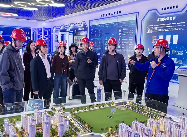 在智能建造指揮中心,項目技術(shù)總工向觀摩團(tuán)介紹了公司基本情況、工程概況,重點(diǎn)圍繞項目智慧工地系統(tǒng),講解了物聯(lián)監(jiān)測、安全管理、質(zhì)量管理、項目進(jìn)度、360度全景等8大模塊內(nèi)容。項目部設(shè)立了智慧工地管理平臺,將項目進(jìn)度、質(zhì)量、安全、勞務(wù)等各方面數(shù)據(jù)集中統(tǒng)一管理,方便了管理人員科學(xué)分析與決策;安裝了塔吊在線監(jiān)測、吊鉤盲區(qū)可視化系統(tǒng),保障吊裝安全,提高了作業(yè)效率;應(yīng)用了揚(yáng)塵噪聲在線監(jiān)測、遙控器控制揚(yáng)塵噴霧等智能系統(tǒng),有效控制了揚(yáng)塵污染……一系列實際應(yīng)用及效果圖片,充分展示了項目高質(zhì)量、智慧化建設(shè)水平,觀摩人員紛紛拿起手機(jī)拍照記錄。