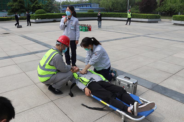 上午10點(diǎn),消防救援支隊(duì)講解員對(duì)全體人員進(jìn)行消防安全知識(shí)培訓(xùn),詳細(xì)講解了防煙面罩正確佩戴方法、疏散逃生要領(lǐng),以及滅火器的使用方法和注意事項(xiàng)。10點(diǎn)半左右,演練正式開(kāi)始,施工現(xiàn)場(chǎng)三區(qū)二層濃煙滾滾,“著火了,著火了¨¨¨”項(xiàng)目安全員在現(xiàn)場(chǎng)巡查時(shí)發(fā)現(xiàn)火情高聲呼喊,周?chē)┕と藛T迅速拿滅火器進(jìn)行滅火,項(xiàng)目經(jīng)理張玉賓接到險(xiǎn)情后馬上通知義務(wù)消防隊(duì)員滅火并組織緊急疏散。大家用濕毛巾捂住口鼻,俯身低頭按照演練逃生路線快速?gòu)默F(xiàn)場(chǎng)撤離到演練集合區(qū)。在大家撤離火災(zāi)現(xiàn)場(chǎng)的同時(shí),救援組孫杰、楊克、董擁軍等人把傷員抬到通風(fēng)處,他們?cè)卺t(yī)療救護(hù)組的指導(dǎo)下,用雙手拍打傷者雙肩并呼叫他的名字、用觸摸頸動(dòng)脈等方法斷傷者是否喪失意識(shí),并進(jìn)行心肺復(fù)蘇。心肺復(fù)蘇演練時(shí),按壓胸部是最有效也是最常用的辦法,施救人員首先在傷者兩乳頭連線中間,胸骨中下三分之一處找準(zhǔn)按壓點(diǎn),然后用手掌根部緊貼傷者胸部,兩手重疊,五指相扣,手指翹起,肘關(guān)節(jié)伸直,用上身重量垂直下壓30次,經(jīng)過(guò)救治傷者最終蘇醒,整個(gè)搶救過(guò)程有條不紊,最后藁城區(qū)消防救援大隊(duì)長(zhǎng)張海寧對(duì)應(yīng)急預(yù)案演練進(jìn)行了點(diǎn)評(píng),此次火災(zāi)應(yīng)急預(yù)案演練圓滿(mǎn)結(jié)束。