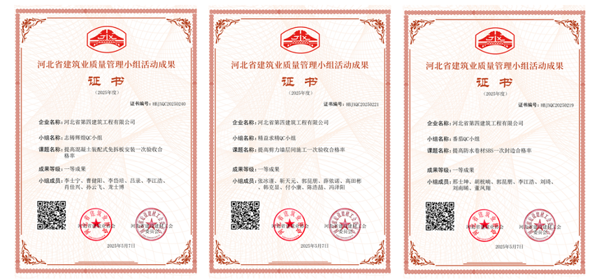 5月15日,七分公司申報(bào)的“提高防水卷材SBS一次封邊合格率”“提高剪力墻層間施工一次驗(yàn)收合格率”“提高混凝土裝配式免拆板安裝一次驗(yàn)收合格率”三項(xiàng)QC成果,被河北省建筑業(yè)協(xié)會評為“一等成果”。這不僅是河北省建筑業(yè)協(xié)會對分公司技術(shù)創(chuàng)新能力的高度認(rèn)可,更是分公司扎實(shí)開展QC小組活動、有效攻克施工難題、提升項(xiàng)目施工質(zhì)量的生動寫照。